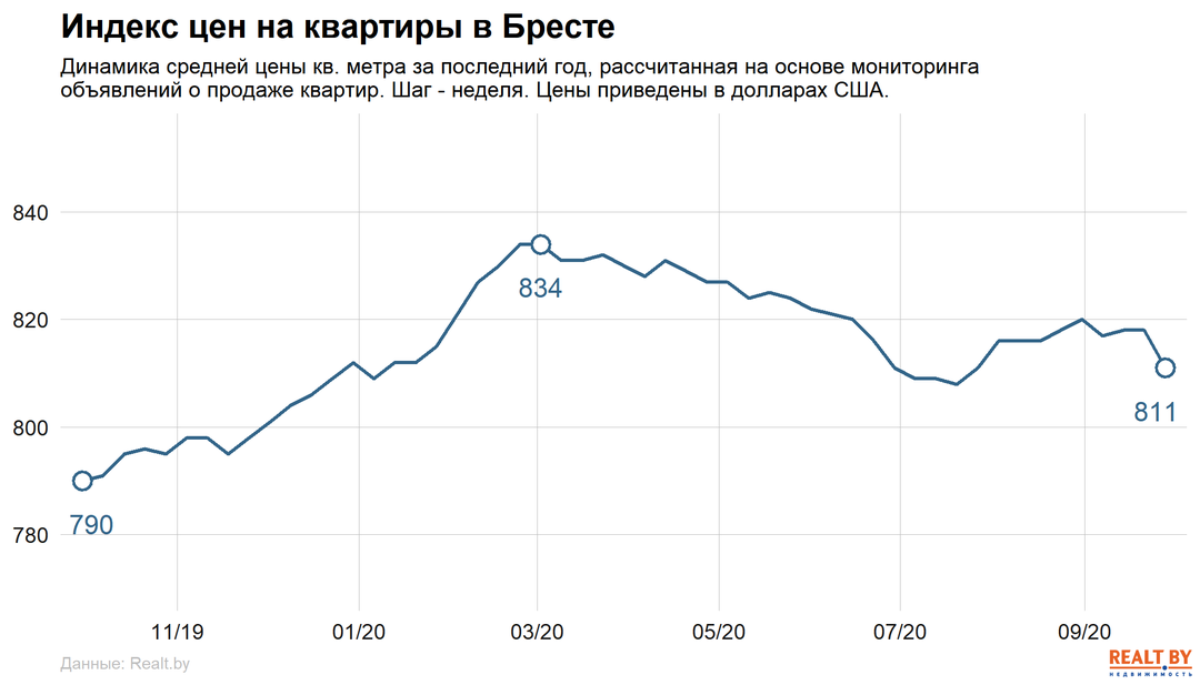 Средняя цена в объявлениях о продаже квартир в Бресте снизилась на 0.8% и составила 811 $/м2.