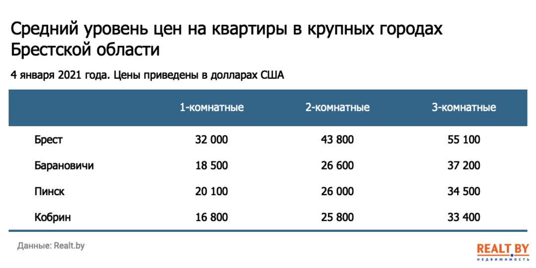 Мониторинг цен предложения квартир в Бресте и городах Брестской области за 28 декабря — 4 января 2021 года