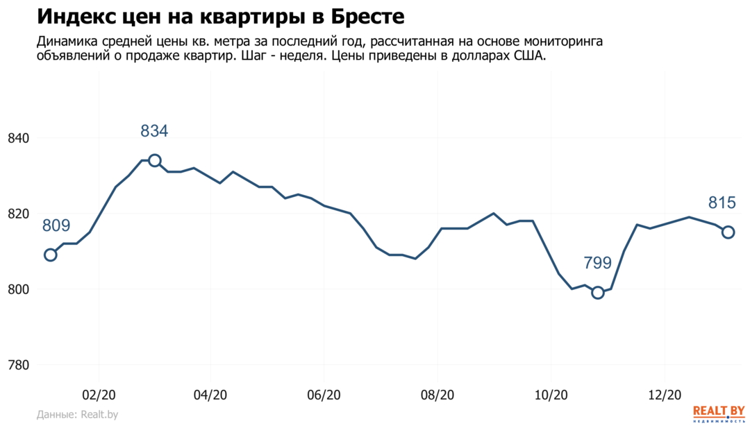 Средняя цена в объявлениях о продаже квартир в Бресте снизилась на 0.2% и составила 815 $/м2.