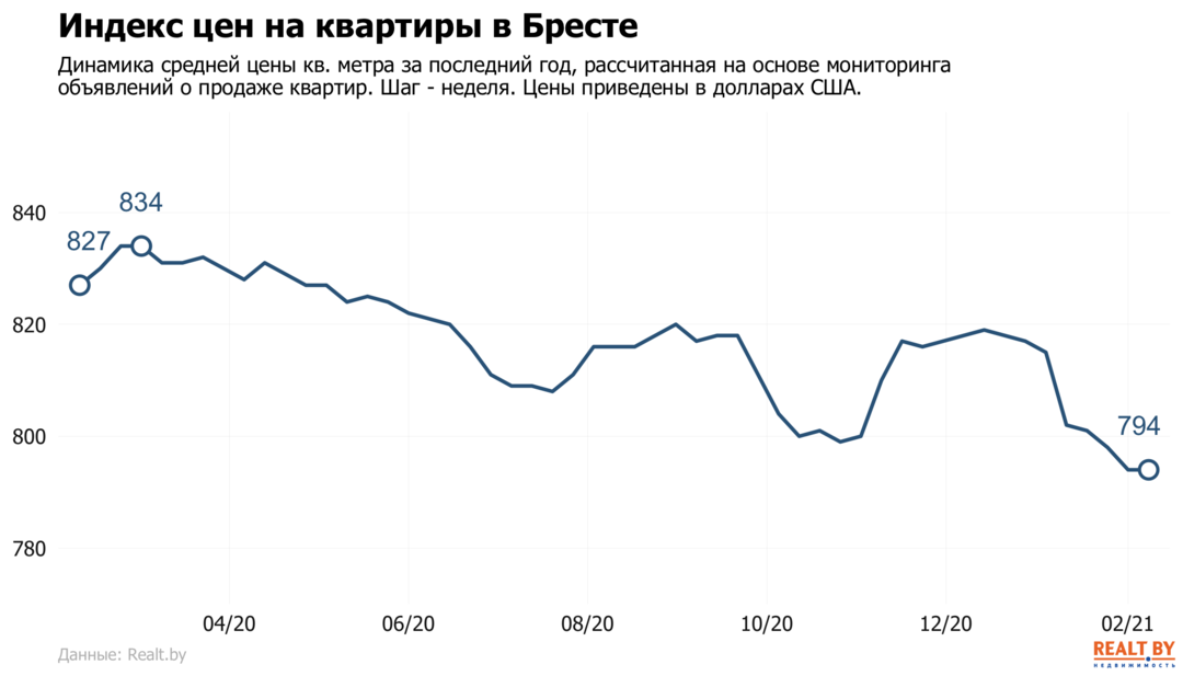 Средняя цена в объявлениях о продаже квартир в Бресте не изменилась и составила 794 $/м2.