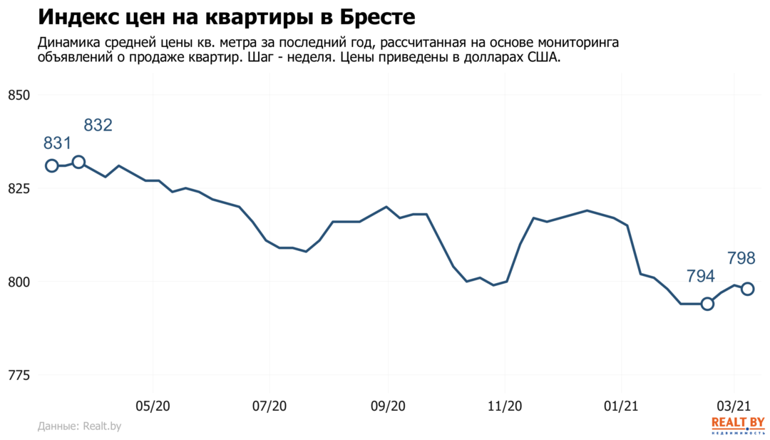 Средняя цена в объявлениях о продаже квартир в Бресте снизилась на 0.1% и составила 798 $/м2.