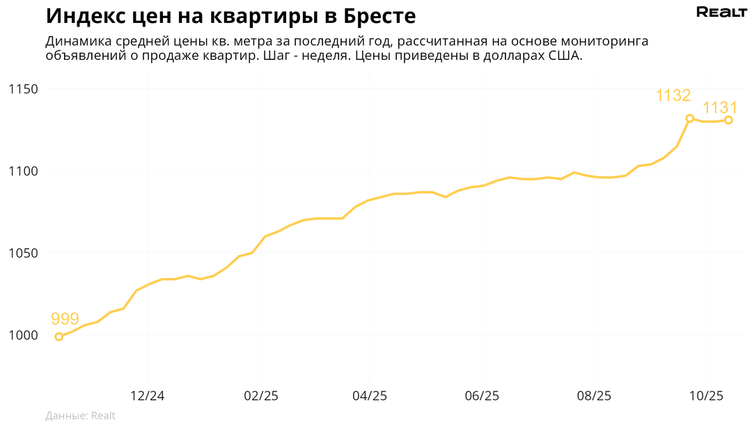 118За неделю, с 6 по 13 октября 2025 года, средняя цена в объявлениях о продаже квартир в Бресте выросла на 0.1% и составила 1131 $/м2. При этом количество квартир в продаже уменьшилось на 0.9%. Что еще произошло на рынке жилья крупнейших городов Брестской области за семь дней — в материале.