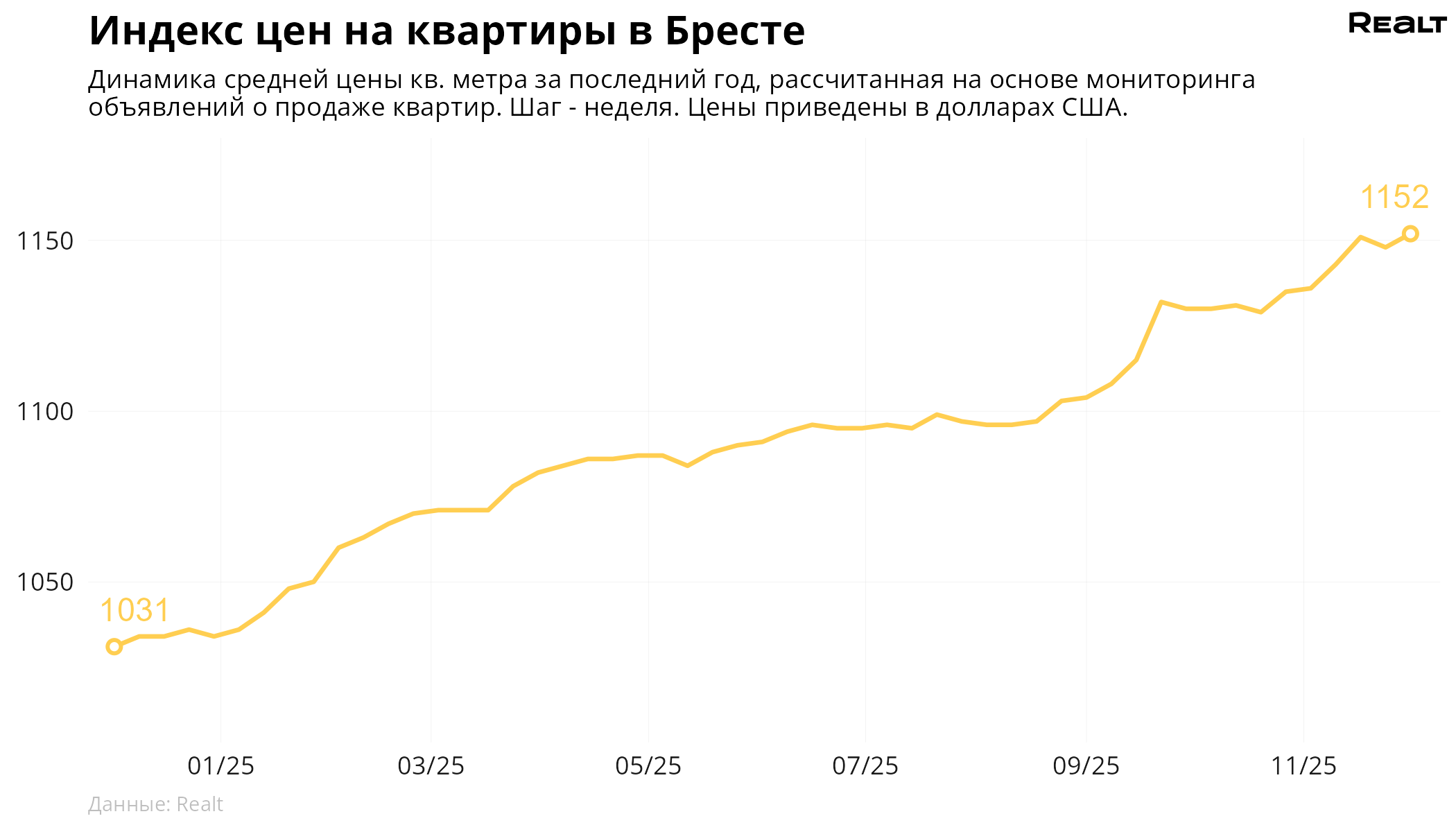 68За неделю, c 24 ноября по 1 декабря 2025 года, средняя цена в объявлениях о продаже квартир в Бресте выросла на 0.3% и составила 1152 $/м2. При этом количество квартир в продаже уменьшилось на 0.7%. Что еще произошло на рынке жилья крупнейших городов Брестской области за семь дней — в материале.
