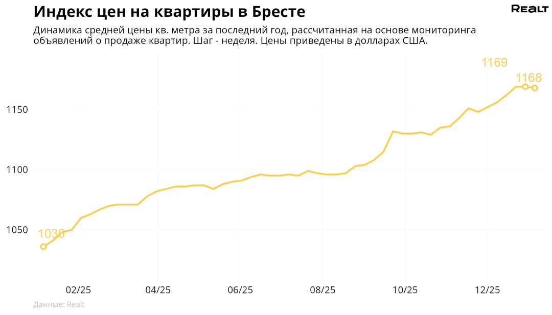 274За неделю, c 29 декабря по 5 января 2026 года, средняя цена в объявлениях о продаже квартир в Бресте снизилась на 0.1% и составила 1168 $/м2. При этом количество квартир в продаже уменьшилось на 4.3%. Что еще произошло на рынке жилья крупнейших городов Брестской области за семь дней — в материале.