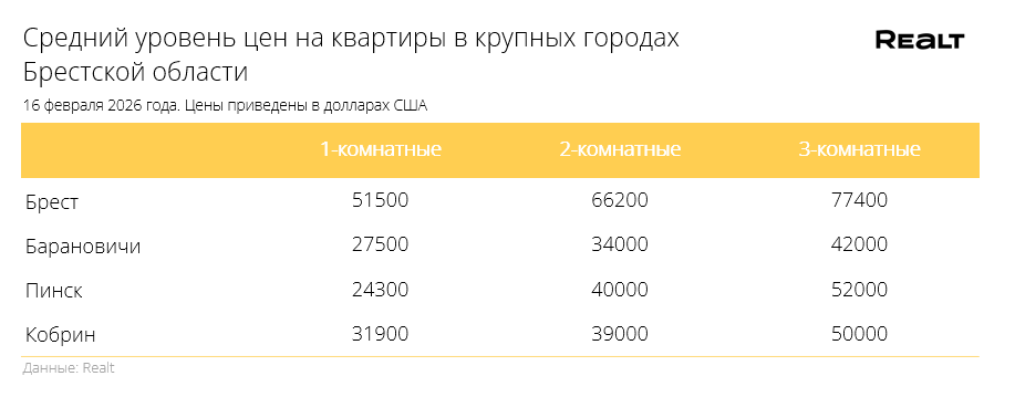 Что происходит с ценами на однушки? Что произошло со стоимостью квартир в Бресте и области за 9−15 февраля 2026 года