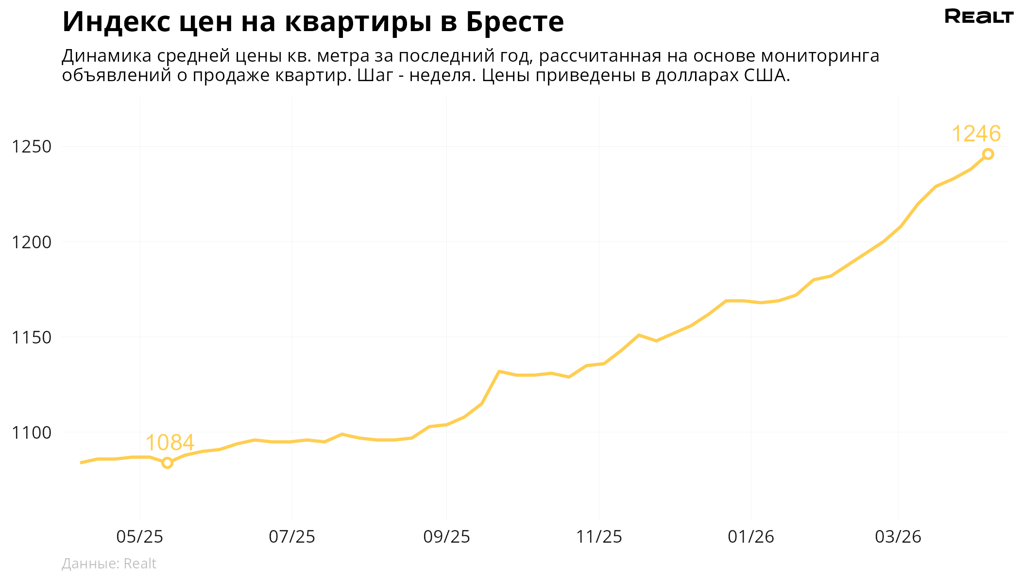 114За неделю, c 30 марта по 6 апреля 2026 года, средняя цена в объявлениях о продаже квартир в Бресте выросла на 0.6% и составила 1246 $/м2. При этом количество квартир в продаже увеличилось на 0.4%. Что еще произошло на рынке жилья крупнейших городов Брестской области за семь дней — в материале.