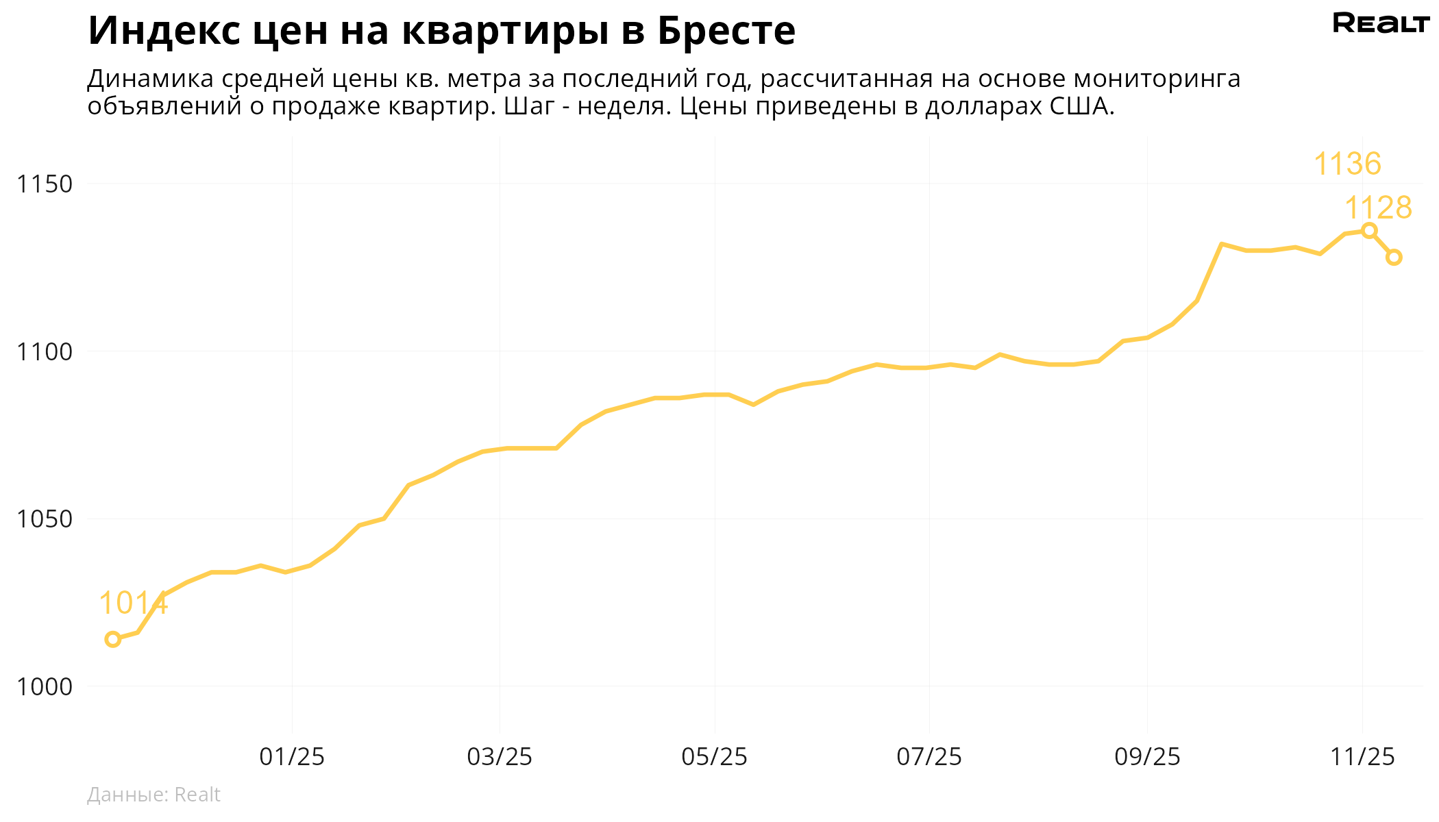 305За неделю, с 3 по 10 ноября 2025 года, средняя цена в объявлениях о продаже квартир в Бресте снизилась на 0.7% и составила 1128 $/м2. При этом количество квартир в продаже увеличилось на 24.7%. Что еще произошло на рынке жилья крупнейших городов Брестской области за семь дней — в материале.
