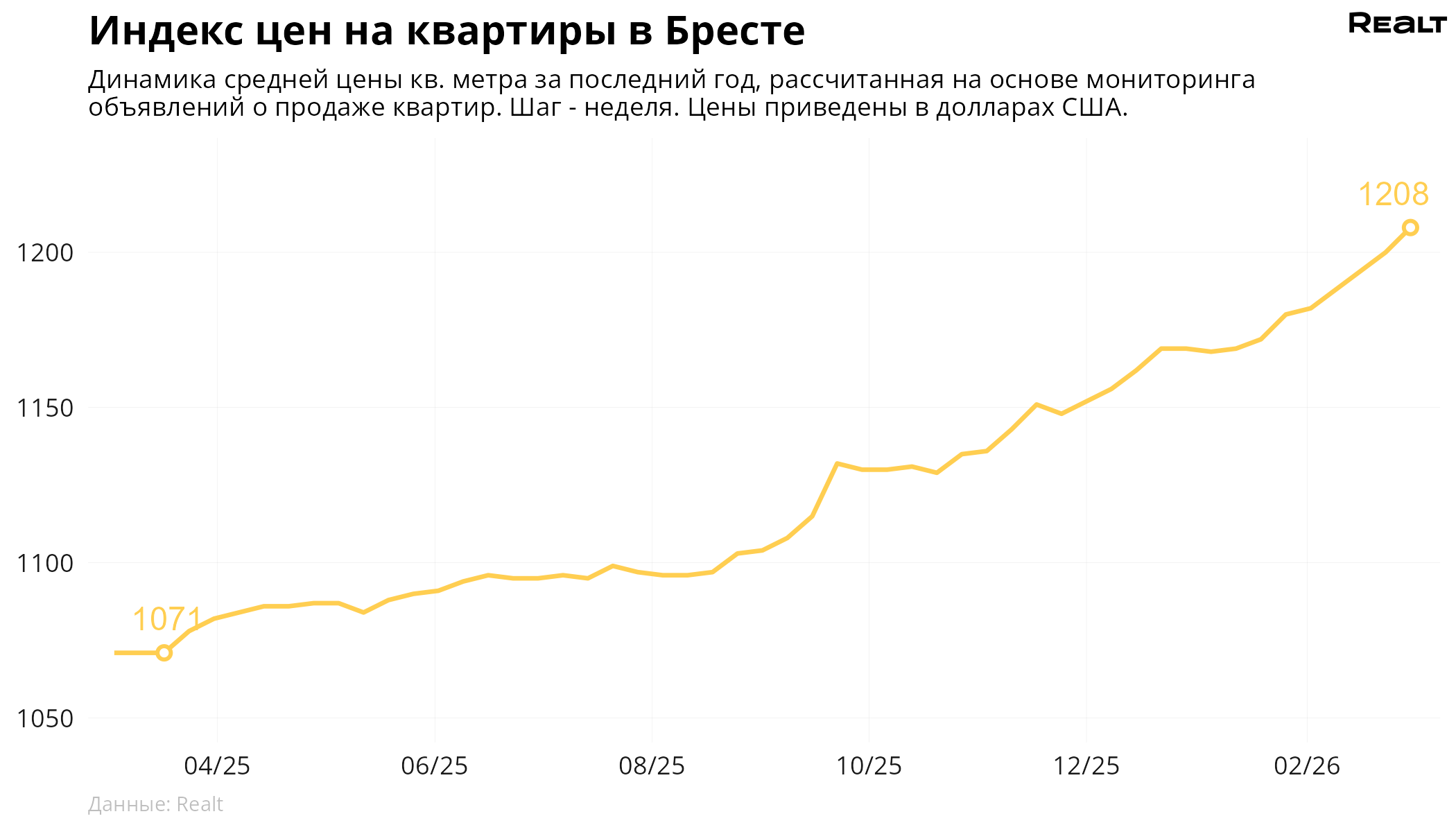 132За неделю, c 23 февраля по 2 марта 2026 года, средняя цена в объявлениях о продаже квартир в Бресте выросла на 0.7% и составила 1208 $/м2. При этом количество квартир в продаже уменьшилось на 1.7%. Что еще произошло на рынке жилья крупнейших городов Брестской области за семь дней — в материале.