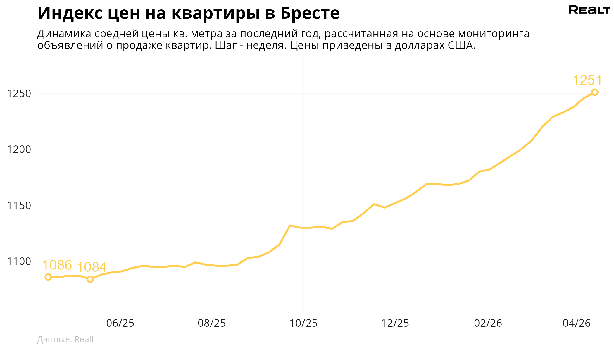 133За неделю, с 6 по 13 апреля 2026 года, средняя цена в объявлениях о продаже квартир в Бресте выросла на 0.4% и составила 1251 $/м2. При этом количество квартир в продаже уменьшилось на 0.8%. Что еще произошло на рынке жилья крупнейших городов Брестской области за семь дней — в материале.