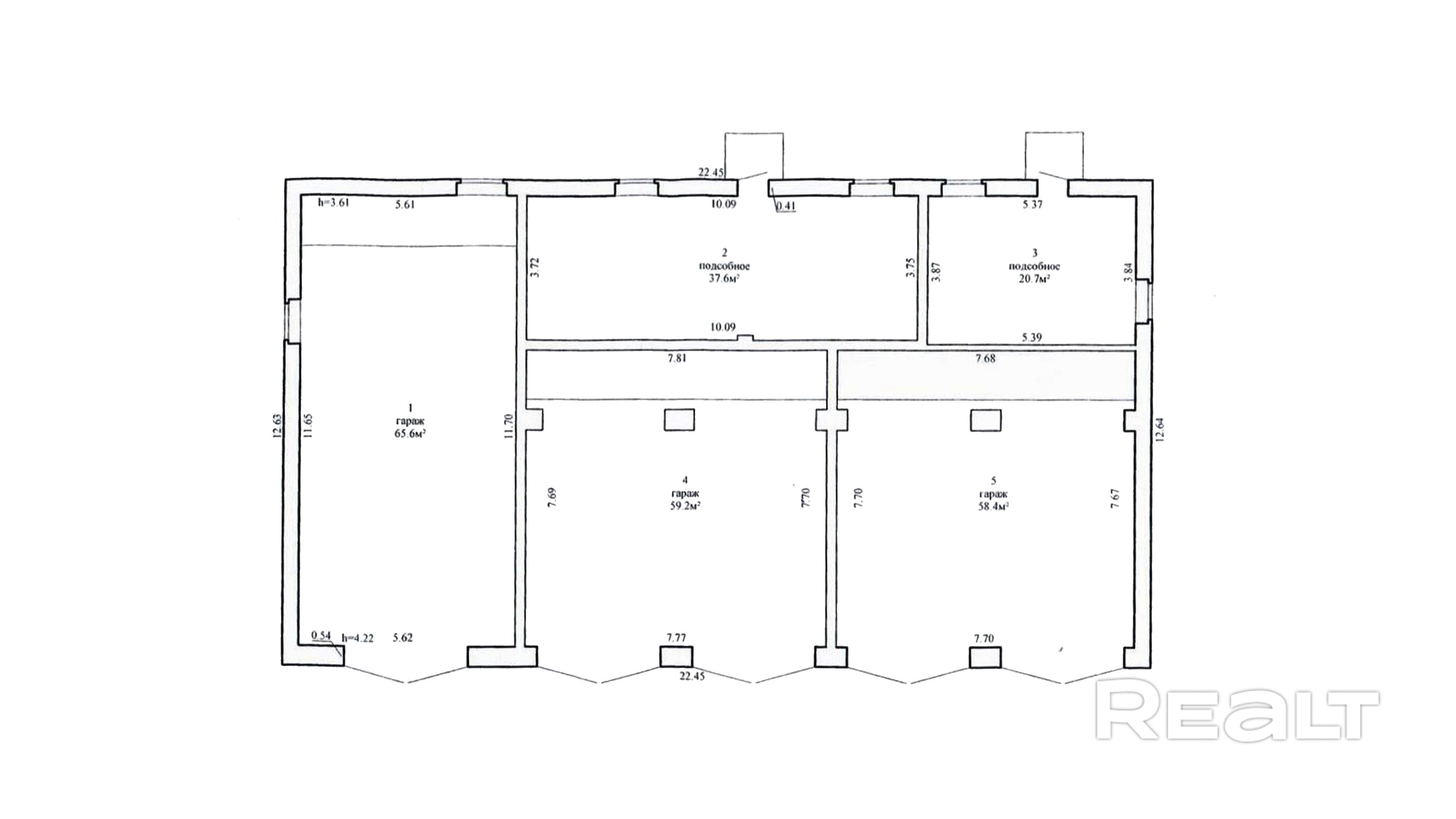 Комплекс гаражей площадью - 241.5 м2, включает в себя: пять помещений: 59 м2 и 59 м2 (в каждом из них по двое въездных ворот), два подсобных помещения каждое с отдельным входом с обратной стороны - 37.6 м2 и 20 м2 и гараж - 65.6 м2.