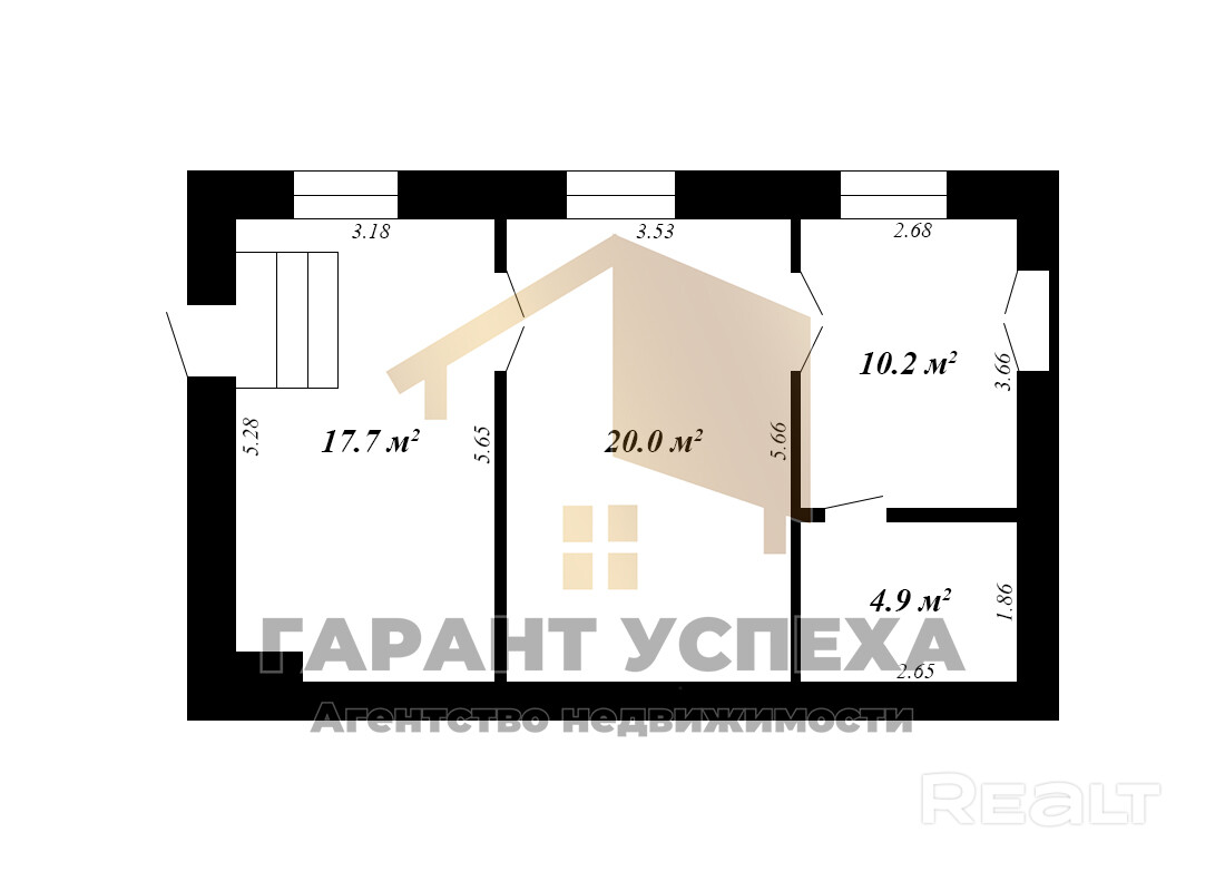 Офис состоит из трех помещений: 20,0; 17,7 и 10,2 кв.м. Также, выделено помещение под санузел.