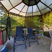 Кроме дома, с тыльной стороны участка есть автомобильный гараж с ямой, хозпостройка, детская горка и уличный душ. Территория участка утопает в зелени, перед домом высажены декоративные растения, а от многолетних плодовых деревьев и кустарников осенью Вы получите щедрый урожай. За домом для любителей огородничества имеется специально отведённая зона с грядками и теплица.
