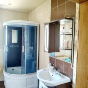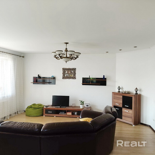 В доме три спальни и кухня-столовая площадью 40.8 м2. Общая площадь по СНБ составляет 283 м2, из которых площадь жилых помещений — 129.7 м2 (жилая площадь — 45.2 м2). Ремонт выполнен в классическом стиле, что придает помещению элегантность и уют. Входная дверь произведена в Польше, что гарантирует высокое качество и надежность. Межкомнатные двери выполнены из натурального дуба, добавляя тепла и уюта в интерьер. В доме установлен подогрев пола, а на полах — ламинат и плитка, что обеспечивает комфорт и легкость в уходе. В санузлах, облицованных современной керамической плиткой, установлена качественная сантехника, душевая кабина, ванна. Потолок утеплен минеральной ватой со стороны чердака, а также дополнительно защищен пенопластом снизу. Это создает уютную атмосферу внутри дома. Внутренние пространства оформлены натяжным потолком, который придает современный вид.