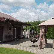 У дома беседка с местом для отдыха. Просторный гараж с подъёмными воротами и хозблок- помещение для хранения хозинвентаря- выполнены в общем стиле усадьбы.