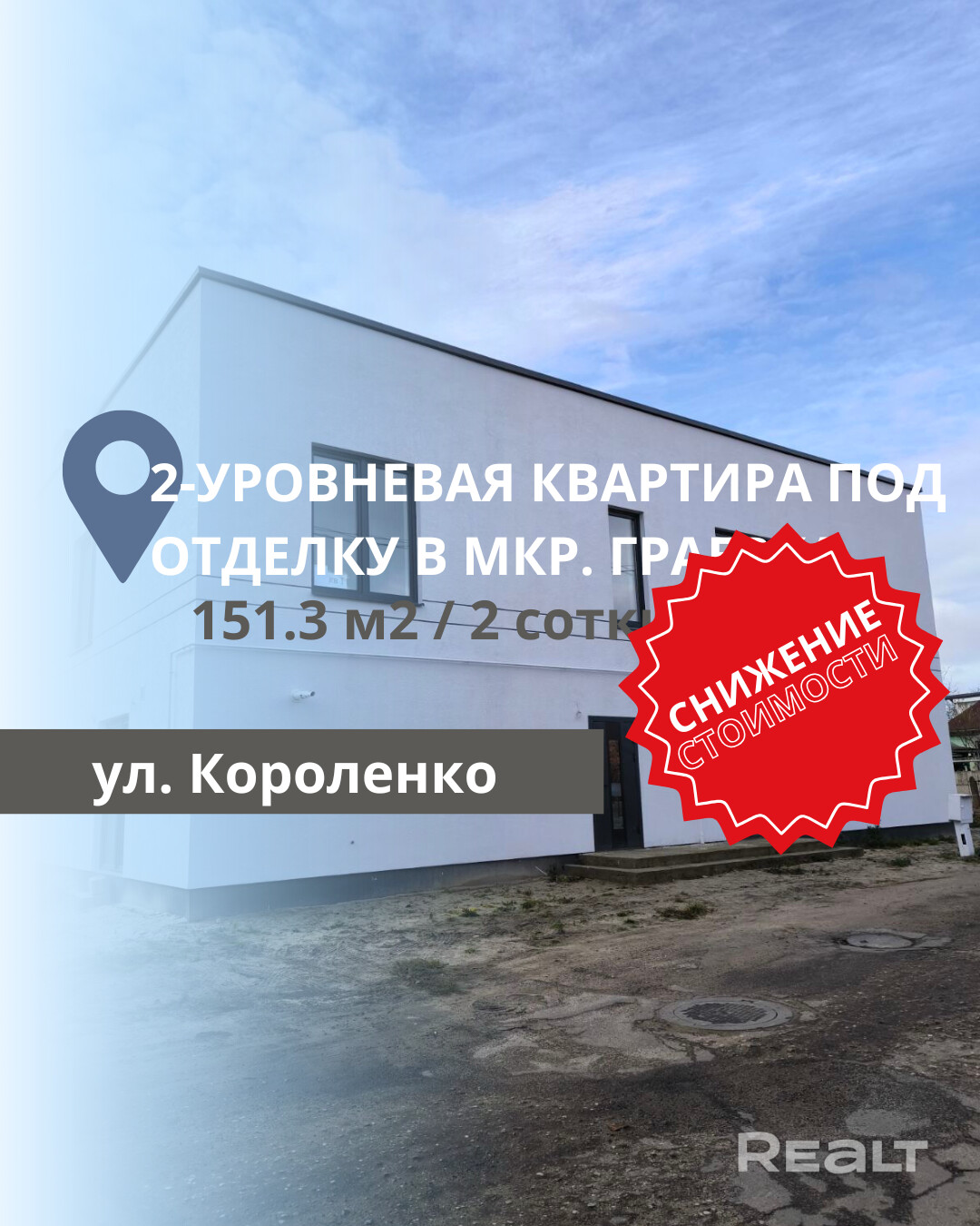 Продается 2-уровневая квартира в блокированном жилом доме под чистовую отделку в г. Бресте, район Граевка, по ул. Короленко (Есть возможность приобрести 2-ю квартиру). Дом блочный, построенный в 2025 году, состоит из двух этажей и располагается на участке площадью ~ 0,0200 га. Общая площадь квартиры составляет 151,3 кв.м, из которых жилая площадь - 67,5 кв.м, а кухня - 36,5 кв.м. Квартира включает четыре комнаты и два санузла, высота потолков составляет 2,90 м.