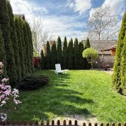 Участок ограждён по периметру профнастилом. Ухоженный газон, вечнозелёные туи, огород "без фанатизма". Двор вымощен тротуарной плиткой. Своя терраса с навесом и уютной зоной релакса. Парковочное место для двух автомобилей.