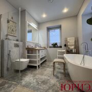В агрогородке Остромечево в живописном месте продается комфортабельный жилой дом 2023 года постройки, построенный на участке 0,15га. Земельный участок в частной собственности. Коммуникации центральные: электричество, газоснабжение, водоснабжение, канализация. Общая площадь дома 166,7м2, жилая - 89,8м2 (3 спальни и гостиная), кухня – столовая - 32м, 2 санузла, терраса - 49м2. Есть вспомогательные помещения: топочная, 2 гардеробные. Фундамент свайно-ростверковый. Стены выложены из блоков ГСМ, облицованы кирпичом. Перекрытия деревянные. Крыша утеплена, накрыта металл черепицей. В доме сделан отличный ремонт. Грамотная планировка дома позволила комфортно расположить спальни и единый комплекс помещений: гостиную – столовую – кухню, откуда можно выйти на террасу. Пристроенная к дому под навесом зона отдыха позволяет круглый год на свежем воздухе отдыхать от шума и городской суеты. Участок выровнен. Огорожен 3д забором. Есть проект дизайна ландшафта участка. На территории залит фундамент для гаража. Невозможно описать место, где построен этот дом - его надо увидеть и влюбиться!