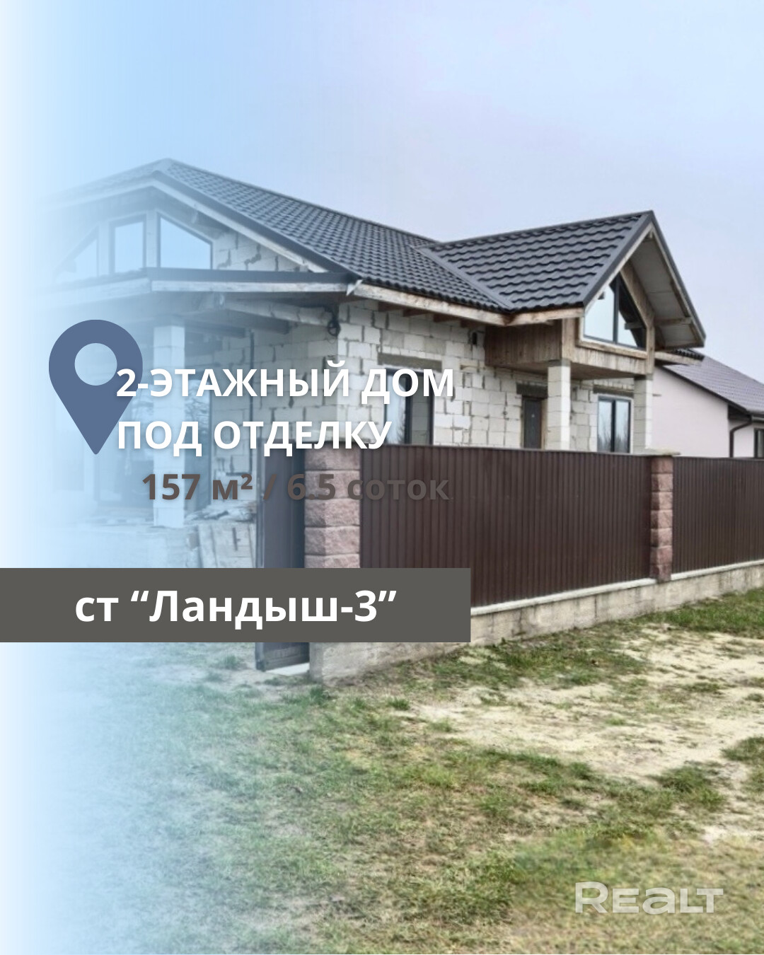 Продаётся двухэтажный дом под отделку в садовом товариществе Ландыш-3, Брестского района, Клейниковского сельсовета. Общая площадь дома составляет 157 кв.м., из которых жилая площадь — 75 кв.м., а кухня-гостиная — 35 кв.м. Дом построен в 2023 году из блоков, накрыт крышей из металлочерепицы, установлены окна, а также имеется забор. Участок площадью 6,5 соток является крайним и расположен в живописном месте, рядом с лесом и рекой. Все необходимые коммуникации есть.