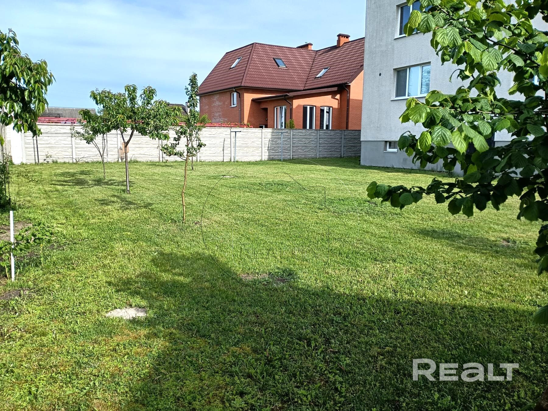 Большой участок на праве частной собственности. По периметру ограждение выполнено высоким бетонным забором. Участок правильной формы, засеян газонной травой. Разбит молодой сад.