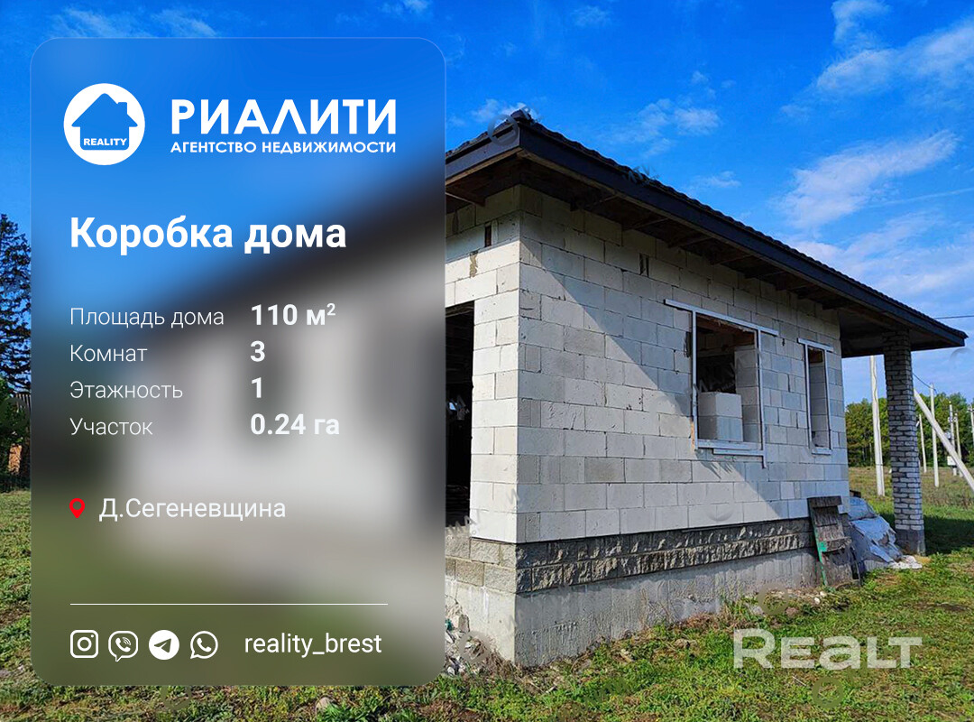 Мы работаем от собственника! Покупая этот объект, Вы не платите агентству комиссию! Продается коробка дома в Брестском районе, в красивом живописном месте д. Сегеневщина. Площадь участка - 24.8 сот. Дом 2018 г. п., 3 просторные комнаты. Общая площадь дома - 110 кв.м., жилая - 70 кв.м., кухня - 19 кв.м. Готовность 30%. Частная собственность.