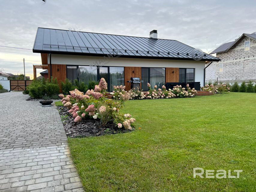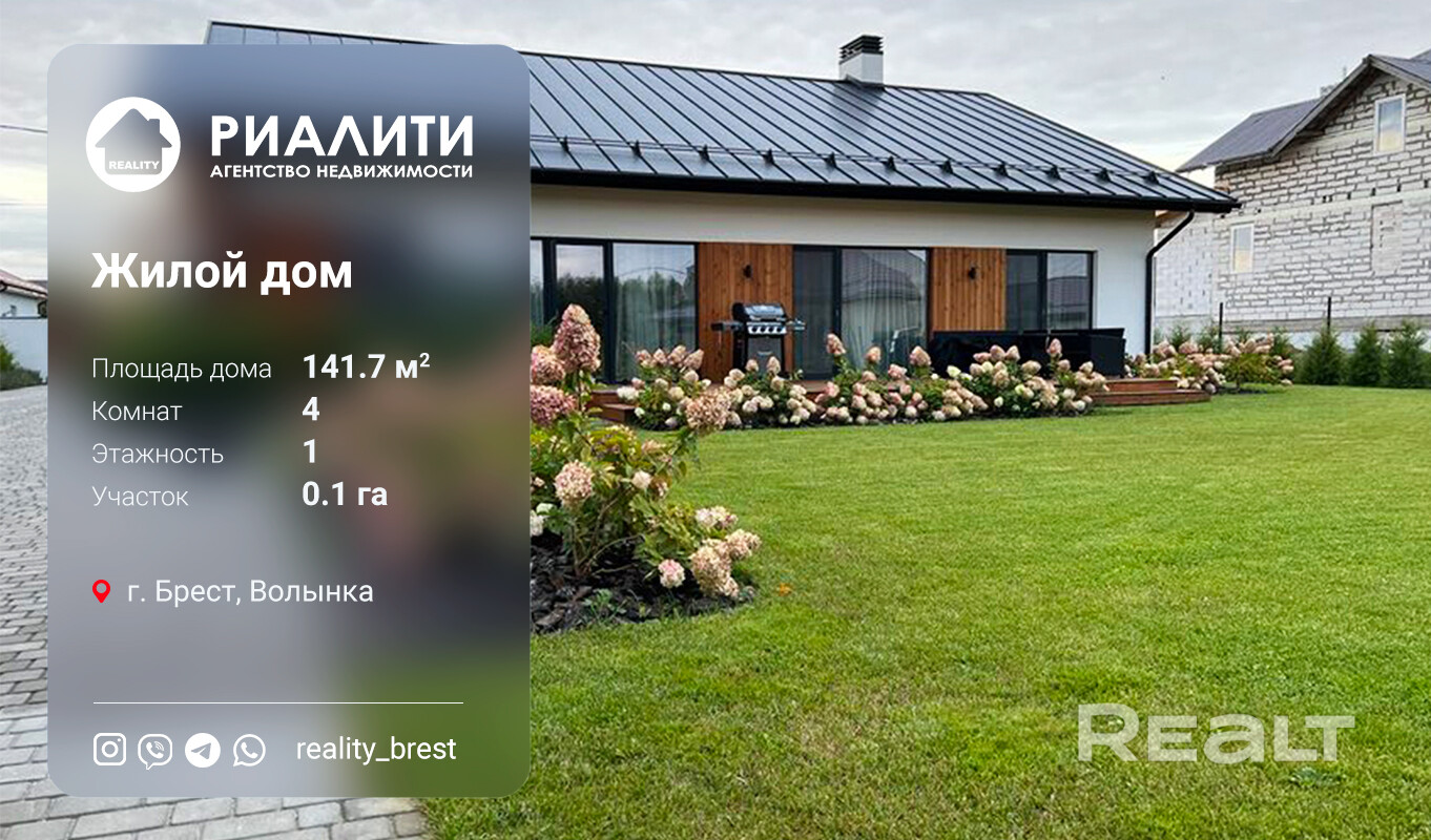 Мы работаем от собственника! Покупая этот объект, Вы не платите агентству комиссию! В мкр. индивидуальной коттеджной застройки Волынка г. Бреста продается современный жилой дом 2021 года постройки. Дом площадью 141,7/86,4/13 м2 расположен на земельном участке 10 соток правильной прямоугольной формы. Фундамент дома-ленточный монолитный, кровля двускатная фальцевая. Стены дома - г/с блоки, утеплены минеральной ватой 10 см. Фасад дома - декоративная штукатурка церизит и деревянные панели. Окна ПВХ панорамные в пол. В доме функционально расположены 4 комнаты: кухня-столовая 48 м2 с выходом на просторную террасу, 3 жилые изолированные комнаты, 2 санузла с душевыми и отдельно стоящей ванной, а также гардеробная и постирочная. На террасе садовая мебель и джакузи с подогревом. В доме установлена система охраны . Ремонт дома выполнен отделочными материалами премиум класса. Полы с подогревом, паркетная доска и плитка. Стены окрашены, потолки - гипсокартон. Ремонт дома выполнен в дизайнерском минималистичном стиле. Минимализм-это не только дизайн дома, но и определенная философия жизни, выраженная в свободе и уверенности. Интерьер дома воплощен в просторных помещениях с обилием воздуха и света и в достаточном количестве функциональных предметов. Вся мебель изготовлена по индивидуальному проекту из дуба и ольхи. Столешницы на кухне и в санузлах из натурального камня. Коттедж продается полностью укомплектованным: мебель, техника, декор и даже посуда остаются новым владельцам. Коммуникации- водоснабжение электроснабжения, газоснабжение и канализация-централизованные. Дополнительно-скважина . Земельный участок с ландшафтным дизайном .Газон с автополивом, имеется робот-газонокосильщик. Уличная подсветка. Сад с плодовыми деревьями и множеством декоративных растений, которые украшают двор дома. На участке имеется гараж 40 м2. Вся необходимая инфраструктура в шаговой доступности. Жилой массив исключительно из индивидуальных жилых домов. Хорошее транспортное сообщение. Код объекта 04726