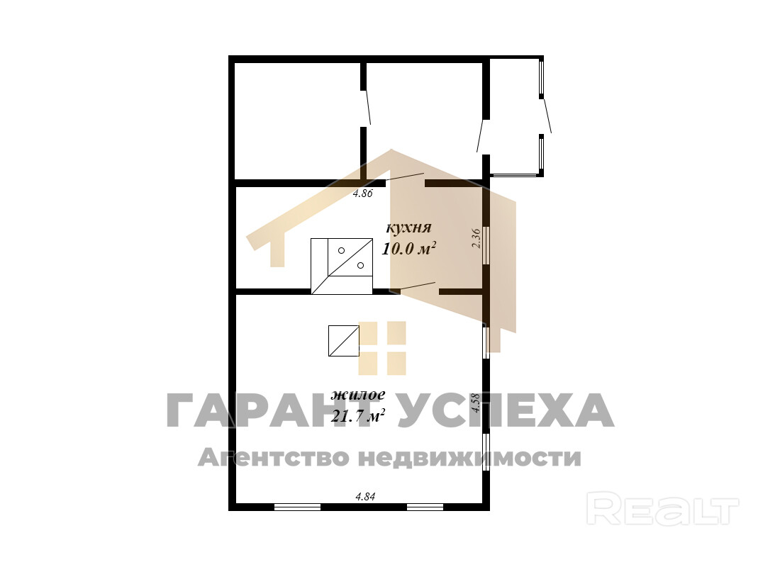 Общая площадь – 31,7 кв. кухня – 10 кв. м. Жилая комната 21,7 кв. м.