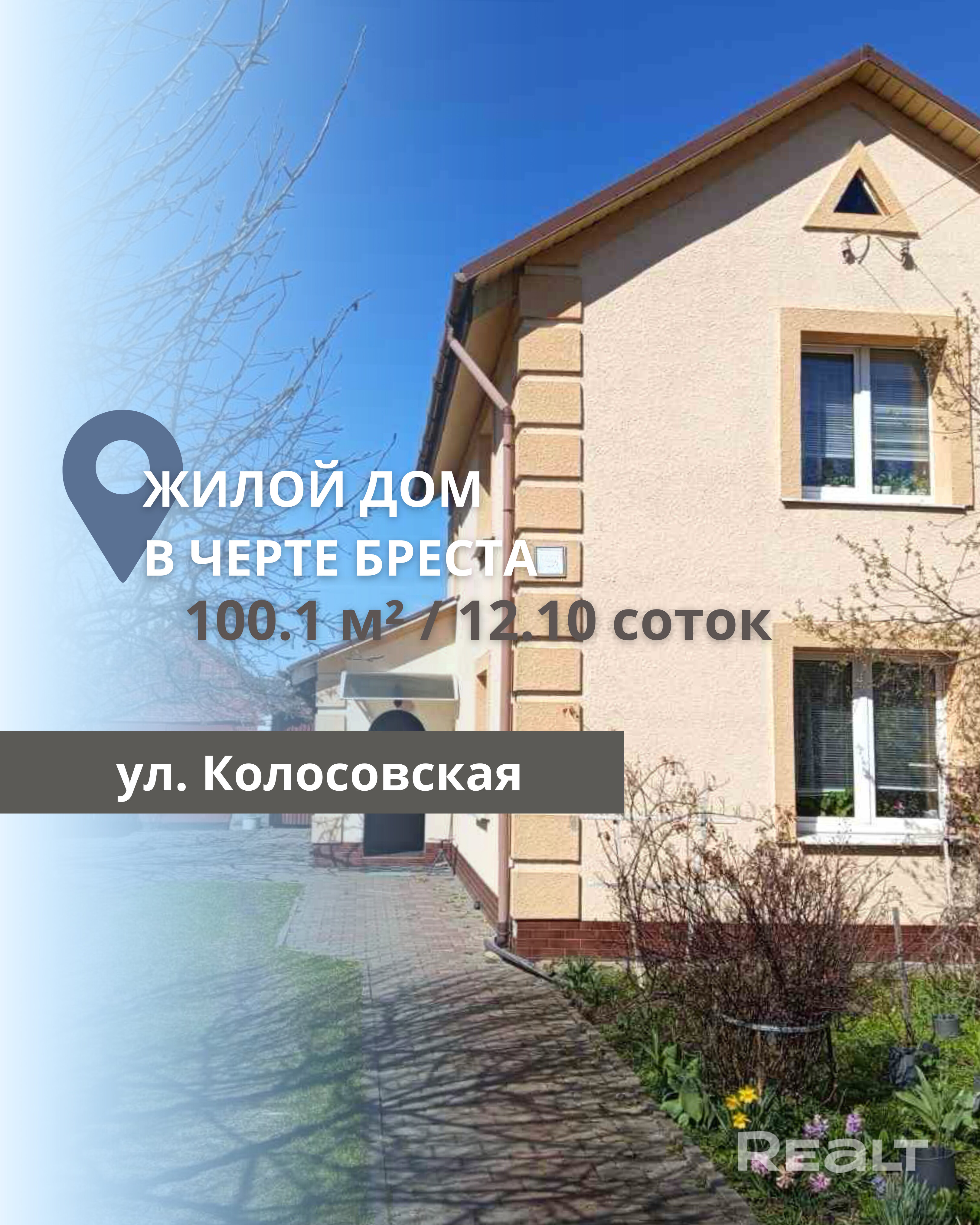 Продаётся двухэтажный жилой дом в г. Бресте по ул. Колосовская. Общая площадь здания составляет 100,1 кв.м, из которых жилая площадь — 56,1 кв.м, а кухня — 13,0 кв.м. В доме четыре жилые комнаты с высотой потолка 2,20 м. Стены выполнены из силикатных блоков и облицованы кирпичом, утеплены пенополистиролом (пенопласт), оштукатурены и окрашены. Кровля покрыта еврошифером (ондулин). Фундамент — ленточный монолитный из бетона с бетонной подушкой.