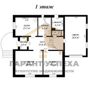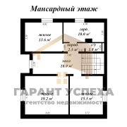 Общая площадь – 185,5/158,7кв. м, жилая – 82,7 кв. м, кухня – 13,5 кв. м. Высота потолка – 2,66 м. Первый этаж: гостиная 20,3 кв. м и жилое/кабинет 14,3 кв. м. Мансардный этаж жилые комнаты 13,6/19,2/15,3 и гардеробная 10 кв. м. Санузлы на каждом этаже. Гараж 26,8 кв. м.