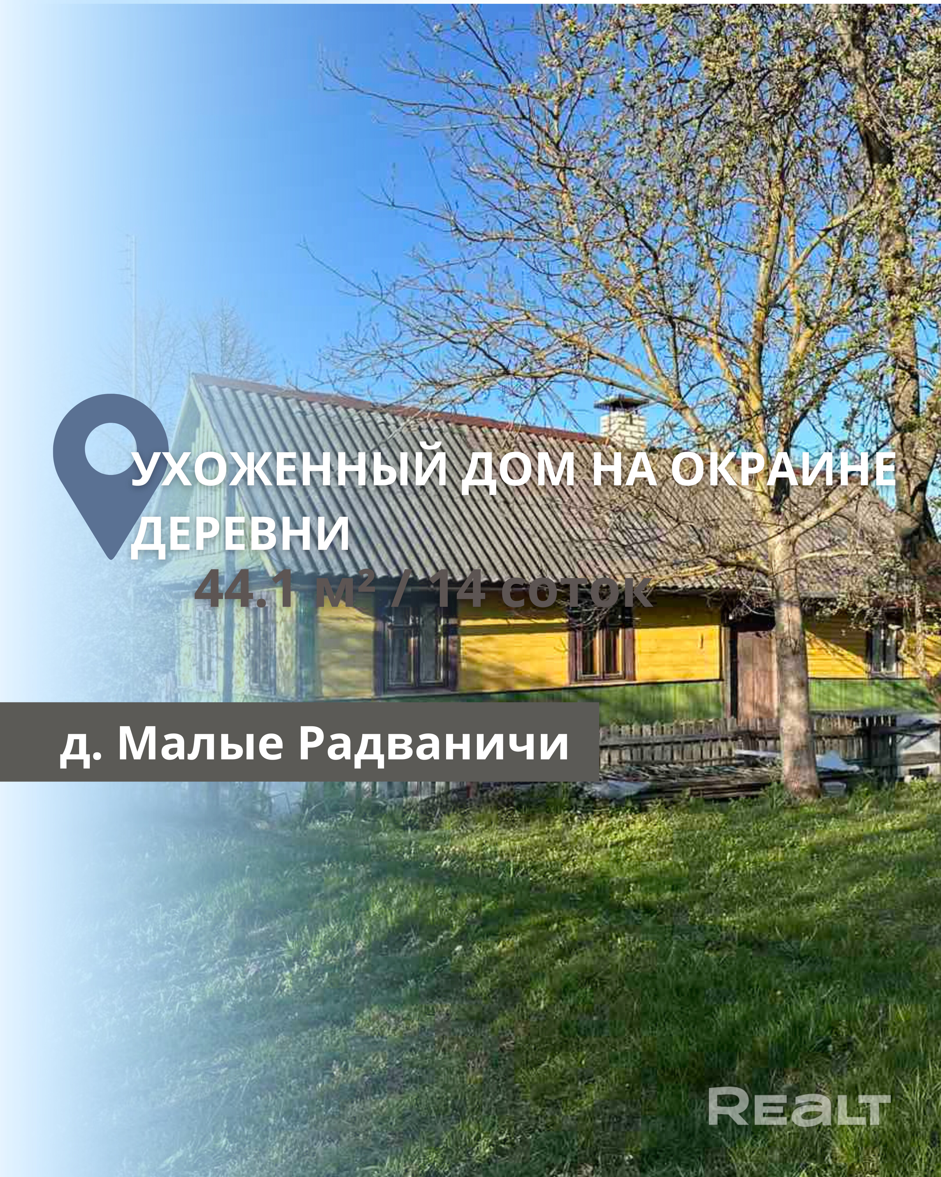 В продаже дом на окраине деревни Малые Радваничи расположен добротный жилой дом 1970 года постройки. Общая площадь строения — 44,1 м2, из которых жилая составляет 22,1 м2, а кухня — 5,7 м2. В доме две жилые комнаты, кухня, летняя комната и кладовая. Фундамент бетонный, стены — из бруса, кровля шиферная. Коммуникации: электричество, водоснабжение из колодца, отопление печное (две рабочие печки), а газопровод проходит рядом с домом. Дом стоит на огороженном по периметру участке 0,14 га. Месторасположение — тихое, спокойное и живописное, идеально подходит как для постоянного проживания, так и для дачи. Всего в 200 метрах протекает река Рита, а деревня имеет отличное транспортное сообщение с Брестом.