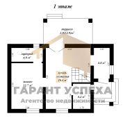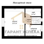 Строение имеет общую площадь 88 кв.м, жилую – 41,3 кв.м без учёта гостиной. Помещения в доме распределены по двум уровням. На 1 этаже находится кухня-гостиная с выходом на крытую террасу и лестничным маршем, совмещённый санузел, одна жилая комната с гардеробной и тамбур. На втором этаже расположена просторная спальня (21,9 кв.м), кабинет и вторая гардеробная.
