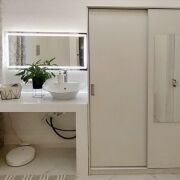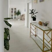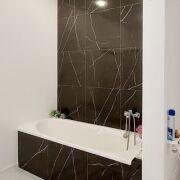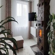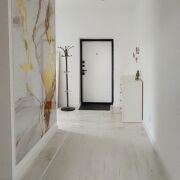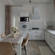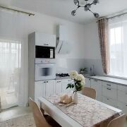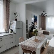 Внутри имеется просторная гостиная зона с кухней площадью 28,7 м2, с выходом на террасу. Две спальни расположены рядом. Выполнен современный ремонт: полы из ламината и плитки, стены окрашены в декоративной технике. В ванной комнате, оформленной керамической плиткой с контрастным дизайном, установлена качественная сантехника. Комнаты обставлены корпусной и мягкой мебелью, а на кухне — встроенный гарнитур с бытовой техникой и обеденная зона.