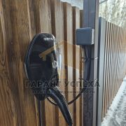 Построен навес под автомобиль: металлическая конструкция с кровлей из металлопрофиля, выполнен в общем стиле дома. Здесь же и оборудована станция зарядки для электромобиля.