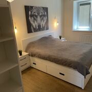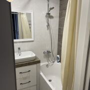 Дизайн квартиры выполнен в светлых тонах. На стенах обои, на полу - дубовый ламинат, потолки - натяжные, межкомнатные двери Rasgar с алюминиевыми профилями. В санузле уложена современная плитка, установлена инсталляция.