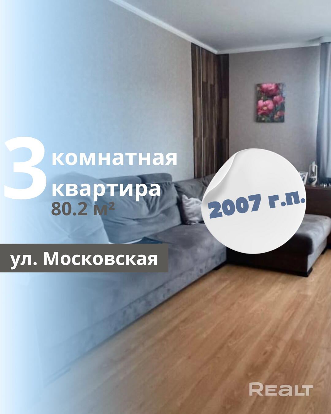 Продается 3-комнатная квартира на улице Московская, в микрорайоне Восток, общей площадью 80,2 кв.м, из которых жилая площадь составляет 44,0 кв.м, а кухня — 10,4 кв.м. Квартира расположена на 4 этаже 5-этажного кирпичного дома, построенного в 2007 году. В квартире раздельный санузел, лоджии застеклены, установлены стеклопакеты, а окна выходят на разные стороны. Входная дверь металлическая, межкомнатные двери выполнены из массива дерева. Помещения находятся в жилом состоянии и оформлены в соответствии с их функциональным назначением. Потолки одноуровневые, окрашены снежкой, полы покрыты ламинатом, плиткой и линолеумом, а стены оклеены обоями в яркой комбинированной технике. Санузел облицован плиткой. Компактный кухонный гарнитур остается в квартире. Установлена домофонная система. Во дворе предусмотрены игровая детская площадка и парковка для автомобилей, что делает данное предложение особенно привлекательным для семей с детьми.