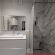 Встроенная кухня в стиле "Современная классика" с техникой Bosch. В санузле имеется стиральная и сушильная машина Electrolux.