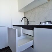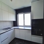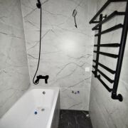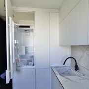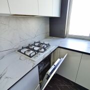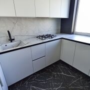 Кухня оборудована функциональным и вместительным гарнитуром с системой Push-to-open и тремя ярусами, а также доводчиками Blum. Вся бытовая техника – новая и включает жарочный шкаф, СВЧ-печь, посудомоечную машину и холодильник Electrolux. В санузле, ванной, кухне, кладовой и прихожей на полу уложен высокопрочный керамогранит с системой «теплый пол», а ванна выполнена из искусственного камня. Установлен электрический проточный моментальный водонагреватель, смеситель в ванной с гигиеническим душем черного карбона фирмы Gappo, а также система защиты от протечек Neotun с Wi-Fi.