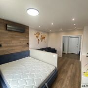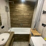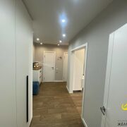 Окна ПВХ. Потолок натяжной. На полу ламинат + плитка(теплые электрополы). Стены оклеены обоями + декоративный кирпич.