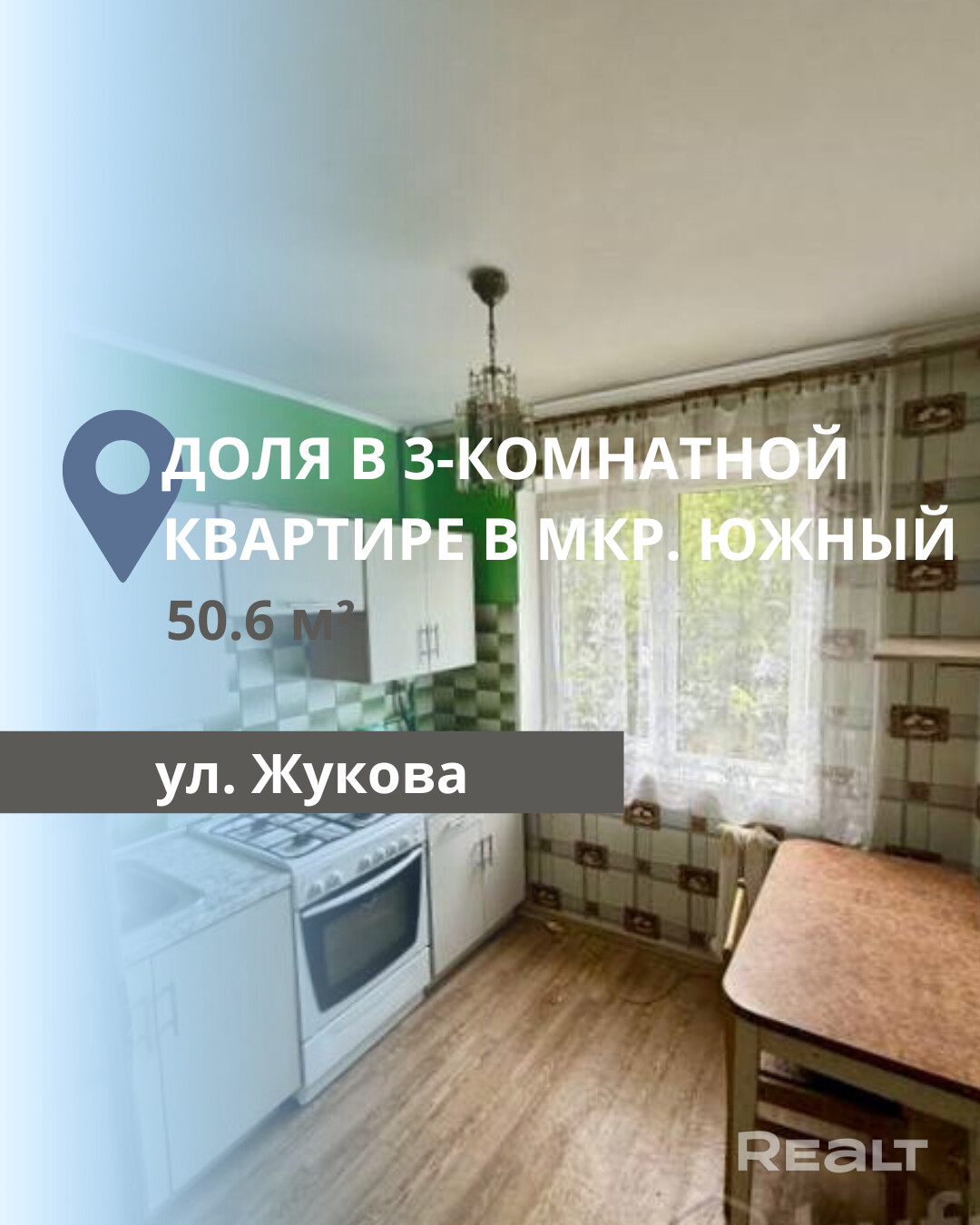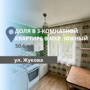 Продается доля в 3-комнатной квартире (379/500), расположенной по адресу: ул. Жукова, на 2 этаже 5-этажного панельного дома. Общая площадь квартиры составляет 50,6 м2, жилая — 34,3 м2, кухня — 5,2 м2.