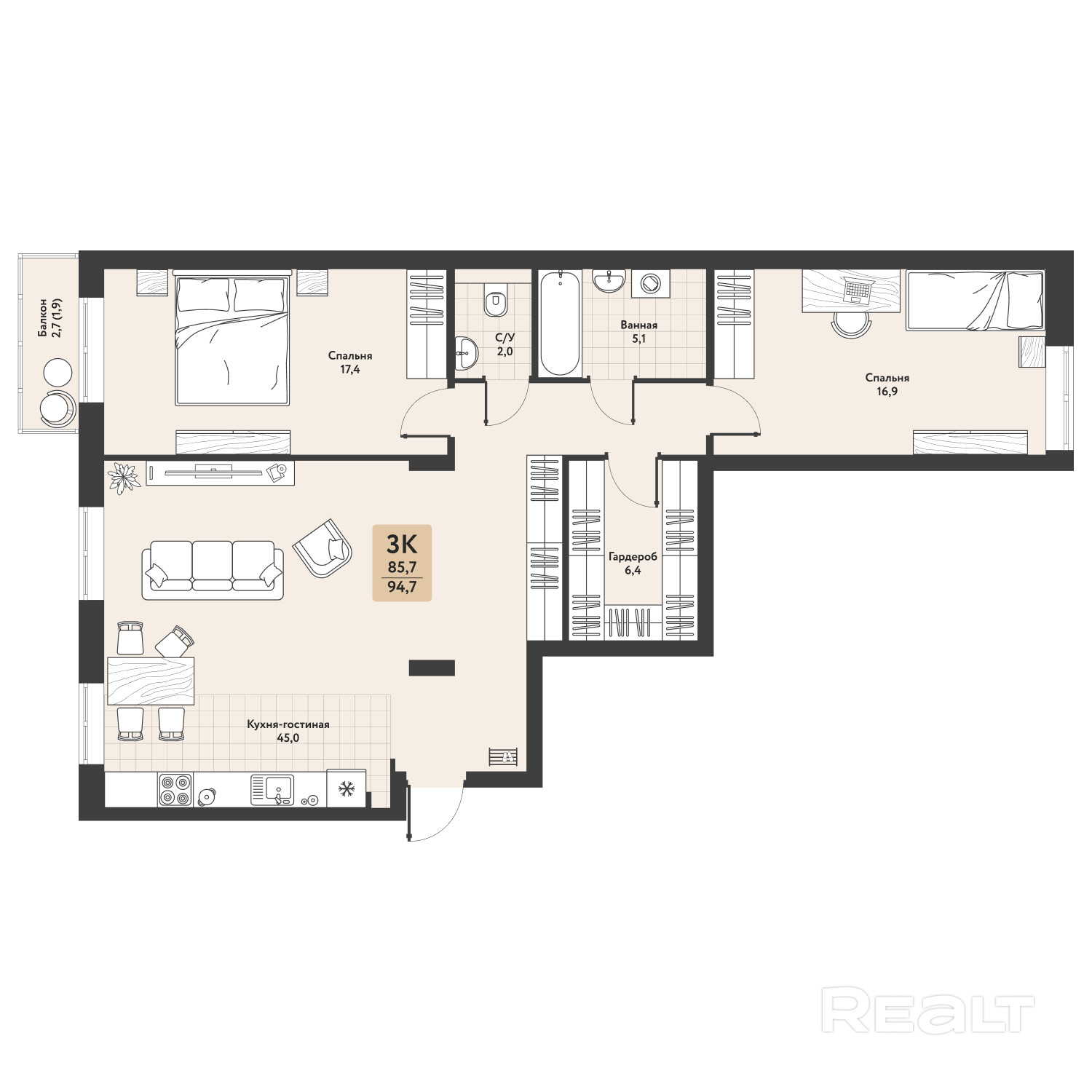 Продается квартира напрямую от застройщика площадью 94.7 квадратных метров, в «Дом на Машерова» Доступны банковские кредиты. Подробнее на сайте https://masherova.aironinvest.by/