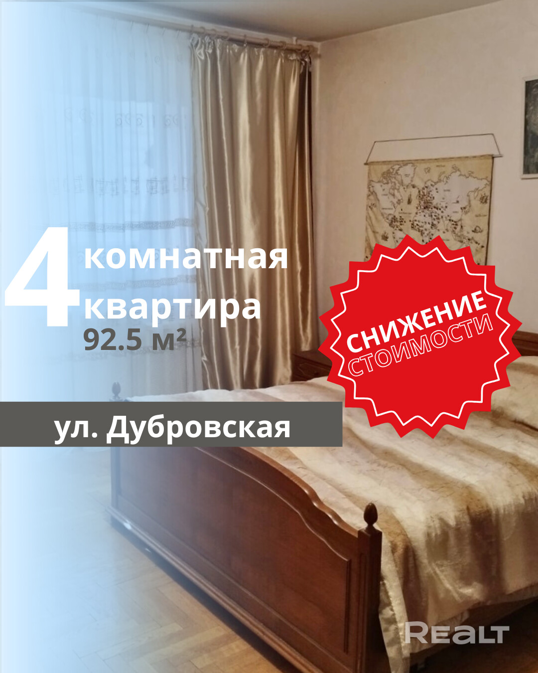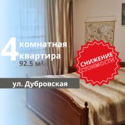 Просторная 4-комнатная квартира на Дубровской, построенная в 1991 году, расположена на первом этаже девятиэтажного панельного дома. Общая площадь квартиры составляет 92,5 кв. м, жилая — 58,4 кв. м, а кухня — 11,7 кв. м. Квартира имеет хороший ремонт и окна, выходящие на две стороны дома. Входная дверь выполнена из металла, полы покрыты паркетом и ламинатом, потолки окрашены, стены оформлены обоями. Окна оборудованы стеклопакетами, а лоджии остеклены. Санузел раздельный.