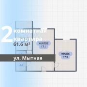 Внутри находятся две жилые комнаты, кухня, коридор, раздельный санузел и лоджия. Общая площадь квартиры составляет 61,6 кв.м, жилая площадь — 34,1 кв.м, кухня — 10,2 кв.м.