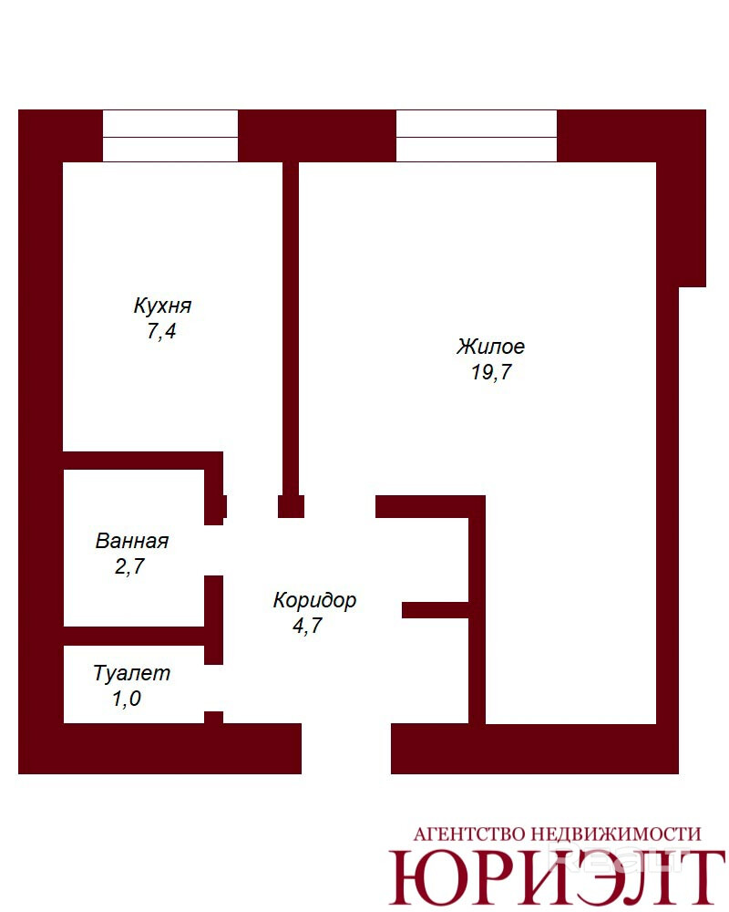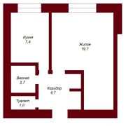 Общая площадь - 36,7 кв.м., жилая - 19,7 кв.м., кухня - 7,4 кв.м.