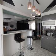 Квартира разделена на зоны: кухня, обеденная зона на утепленной лоджии, полы с подогревом, стеклопакеты, зал отделен от кухни барной стойкой.