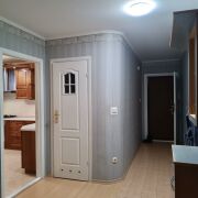Внутреннее пространство включает три изолированные комнаты, два санузла с биде, а также застекленную лоджию. Входная группа представлена двойной дверью, наружная металлическая. Все окна оборудованы стеклопакетами. Потолки оформлены в стиле "снежка", полы выполнены из ламината и плитки, в кухне — линолеум, всё на стяжке. Стены оклеены обоями.
