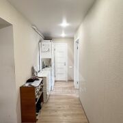 В квартире частично обновлен ремонт. Санузел облицован плиткой, на полу в жилых комнатах и коридоре ламинат, в кухне линолеум. Во всех помещениях кроме кухни сделаны натяжные потолки, стены оклеены обоями. В одной из комнат есть выход на застекленную лоджию. Из лоджии есть спуск в кладовую (подвал).