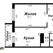Площадь квартиры по СНБ 45 кв.м., общая площадь 42.4 кв.м., жилая 17.1.кв.м., кухня-11кв.м. с выходом на остекленную лоджию.