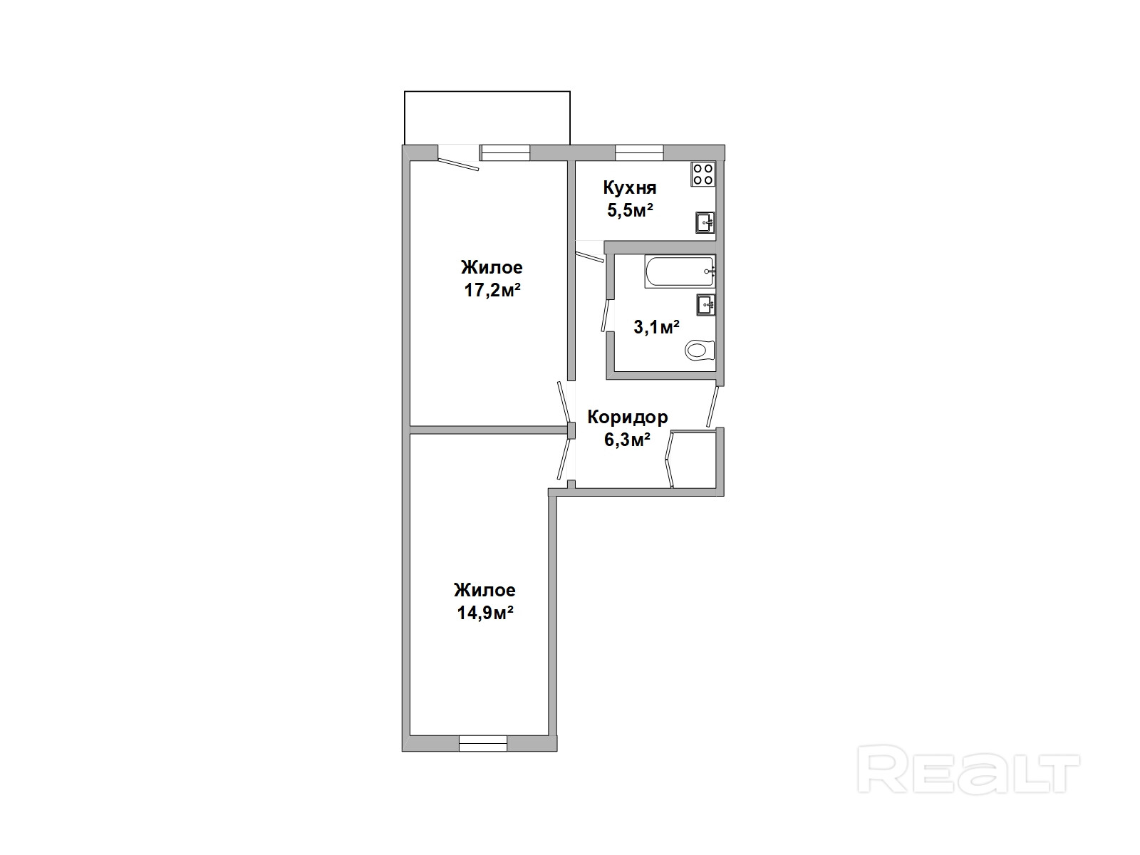 Двухкомнатная квартира на 2 этаже 5-этажного панельного в восточной части города. Общая площадь 48,3 кв.м, жилая 32,1 кв.м. Классическая планировка: две просторные жилые комнаты с застекленным балконом расположены напротив друг друга, кухня 5,5 кв.м, санузел раздельный.