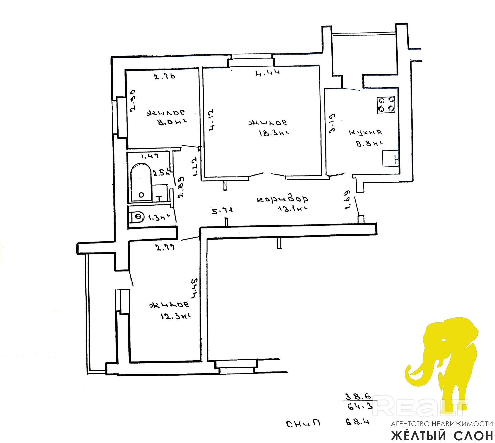 площадь: 68,4/64,3/38,6/8,8 кв.м.
