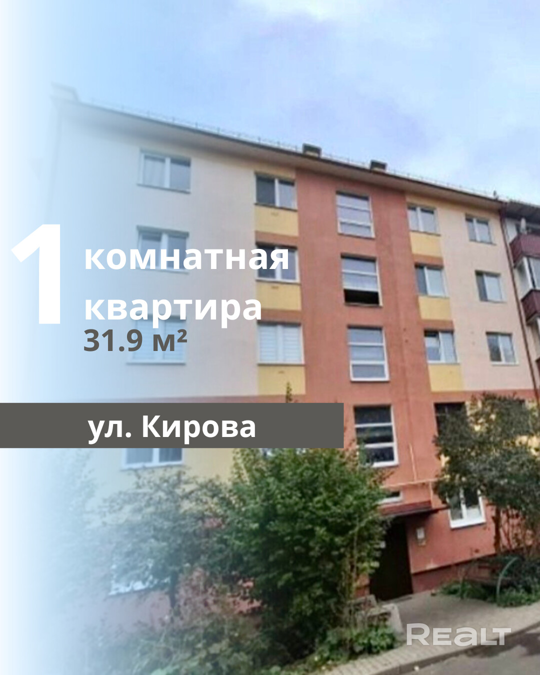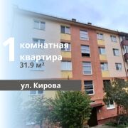 Продается однокомнатная квартира в центре города по улице Кирова, расположенная на первом этаже пятиэтажного кирпичного дома, построенного в 1971 году. Квартира требует ремонта и состоит из одной жилой комнаты, кухни, коридора и раздельного санузла. Общая площадь квартиры составляет 31,9 кв. м., жилая площадь — 17,3 кв. м., кухня — 5,7 кв. м.