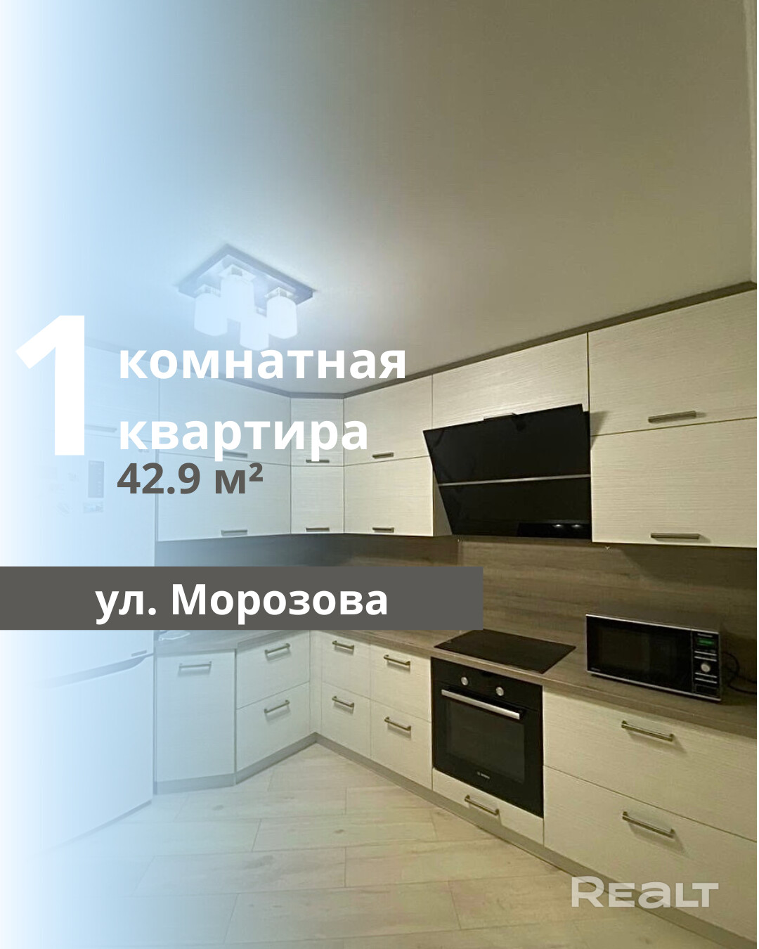 СРОЧНАЯ ПРОДАЖА! Предлагается уютная однокомнатная квартира с современным ремонтом и мебелью, расположенная в юго-западной части города по ул. Морозова. Квартира находится на 2 этаже 15-этажного кирпичного дома, построенного в 2016 году. Площадь квартиры составляет 42,9 кв.м. по СНБ, общая площадь – 39,7 кв.м., жилая – 20,2 кв.м., кухня – 9,9 кв.м. Балкон застеклен и утеплен, окна оборудованы рольшторами, входная дверь металлическая, а межкомнатные выполнены из шпона. Санузел раздельный, отделан современной плиткой, с дополнительной вытяжкой, акриловой ванной и подвесным унитазом с инсталляцией GROHE. Установлены фильтры очистки воды на входе и система водоочистки с обратным осмосом на кухне. Интерьеры оформлены в спокойных светлых тонах, выполнен качественный ремонт: потолки окрашены, полы – ламинат в комнате, плитка в кухне и прихожей, стены оклеены моющимися обоями. Новому собственнику остаются встроенный стол, шкаф-купе и корпусная мебель в комнате, а также шкаф-купе в прихожей. Кухонный гарнитур укомплектован техникой BOSCH: варочная индукционная поверхность, духовой шкаф и мощная вытяжка, подоконники гармонично подобраны к основной столешнице. В доме установлены домофон и система видеонаблюдения, подъезд оборудован пассажирским и грузовым лифтами. Дом с пандусом расположен в глубине двора, где есть игровая детская площадка и парковка для автомобилей с обеих сторон здания. В шаговой доступности находятся школа, детский сад и магазины Ома, Санта, Евроопт и другие. Не упустите возможность стать владельцем этой замечательной квартиры!